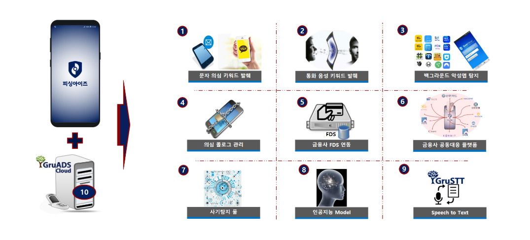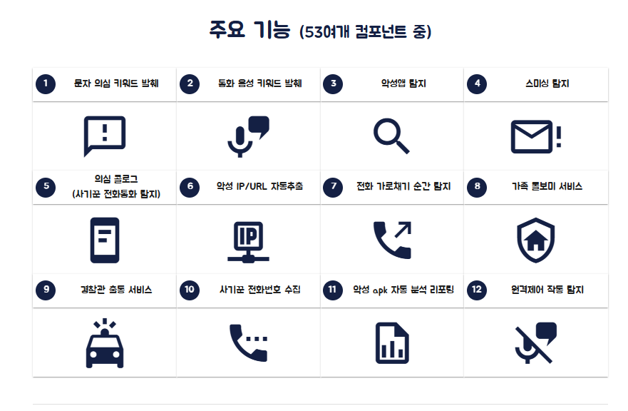 스마트폰에 설치된 악성 앱(사기 앱, 금융기관 사칭 앱, 경찰/검찰 사칭 앱 등)을 실시간으로 탐지하여 알려줍니다.