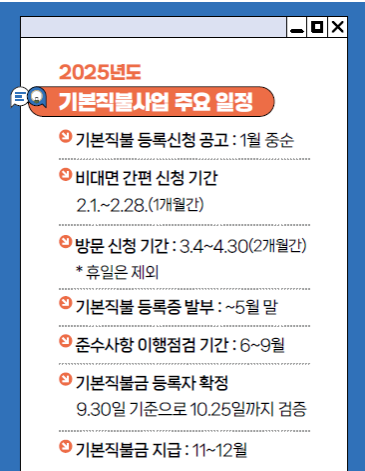 기본형 공익직불금 신청은 매년 초 농지 소재지 관할 읍면동 행정복지센터에서 접수를 받습니다. 일반적으로 3~5월 사이에 신청을 받고 있으며, 2025년도 기준 일정은 농림축산식품부나 지자체 홈페이지에서 공고됩니다.
