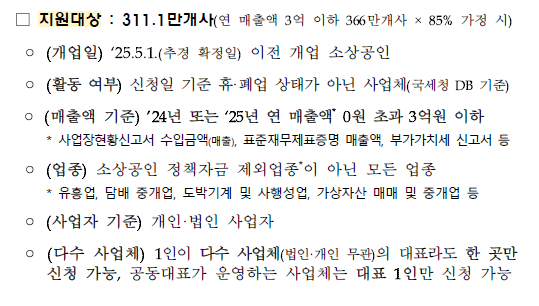 2025년 5월 1일 이전에 개업한 사업체 신청일 기준으로 휴업 또는 폐업 상태가 아닌 사업체 (국세청 자료 기준) 2024년 또는 2025년 중 연 매출 3억 원 이하 정책자금 제외 업종(유흥업, 도박업, 가상자산업 등)이 아닐 것 개인사업자와 법인사업자 모두 신청 가능 1인이 다수 사업체 운영 시, 1곳만 신청 가능