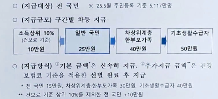 - 일반 국민(건보료 하위 90%): 15만원(1차) + 10만원(2차) = 25만원