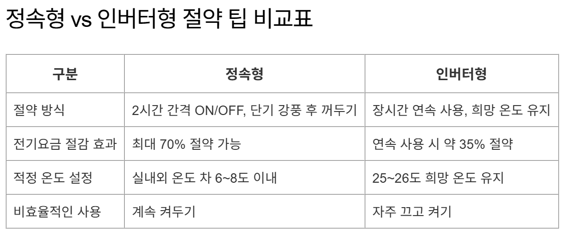 정속형과 인버터형 에어컨의 전기세 절약 방법은 서로 다릅니다. 정속형은 짧게 강하게, 자주 꺼주는 것이 절약에 도움이 되고, 인버터형은 장시간 연속 운전이 핵심입니다.