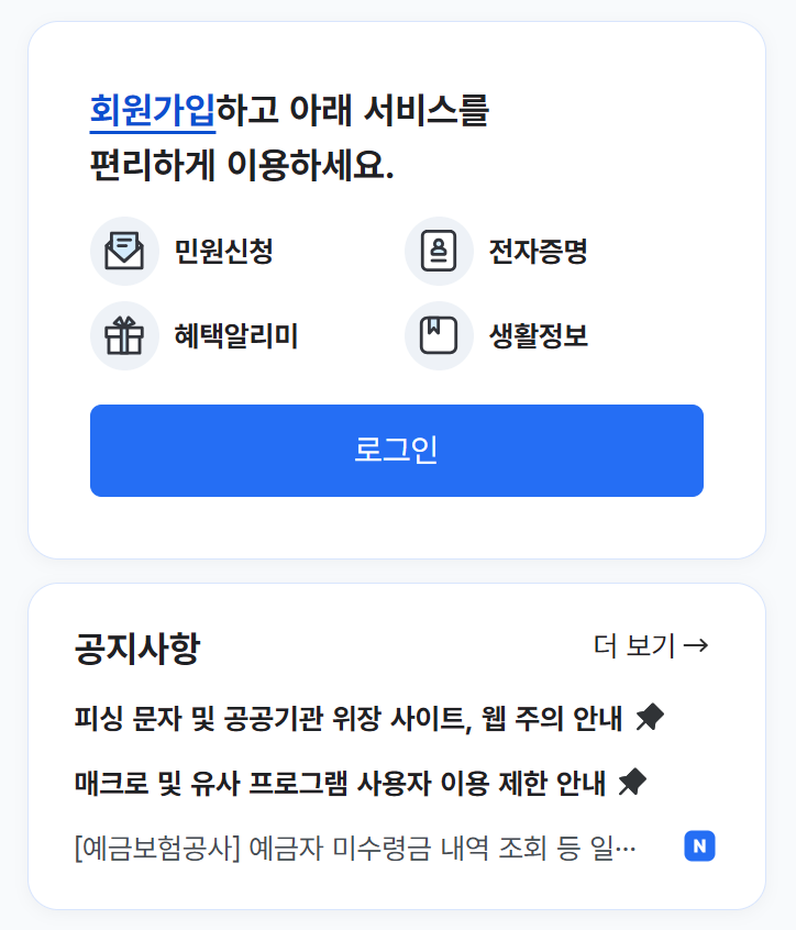 회원가입 시 입력하는 정보는 최소한으로 구성되어 있으며, 대부분의 개인정보는 이미 국가 행정 시스템과 연계되어 자동으로 확인됩니다. 따라서 이용자가 직접 입력해야 할 항목은 많지 않으며, 안내에 따라 차분히 진행하시면 어렵지 않게 가입을 완료하실 수 있습니다.